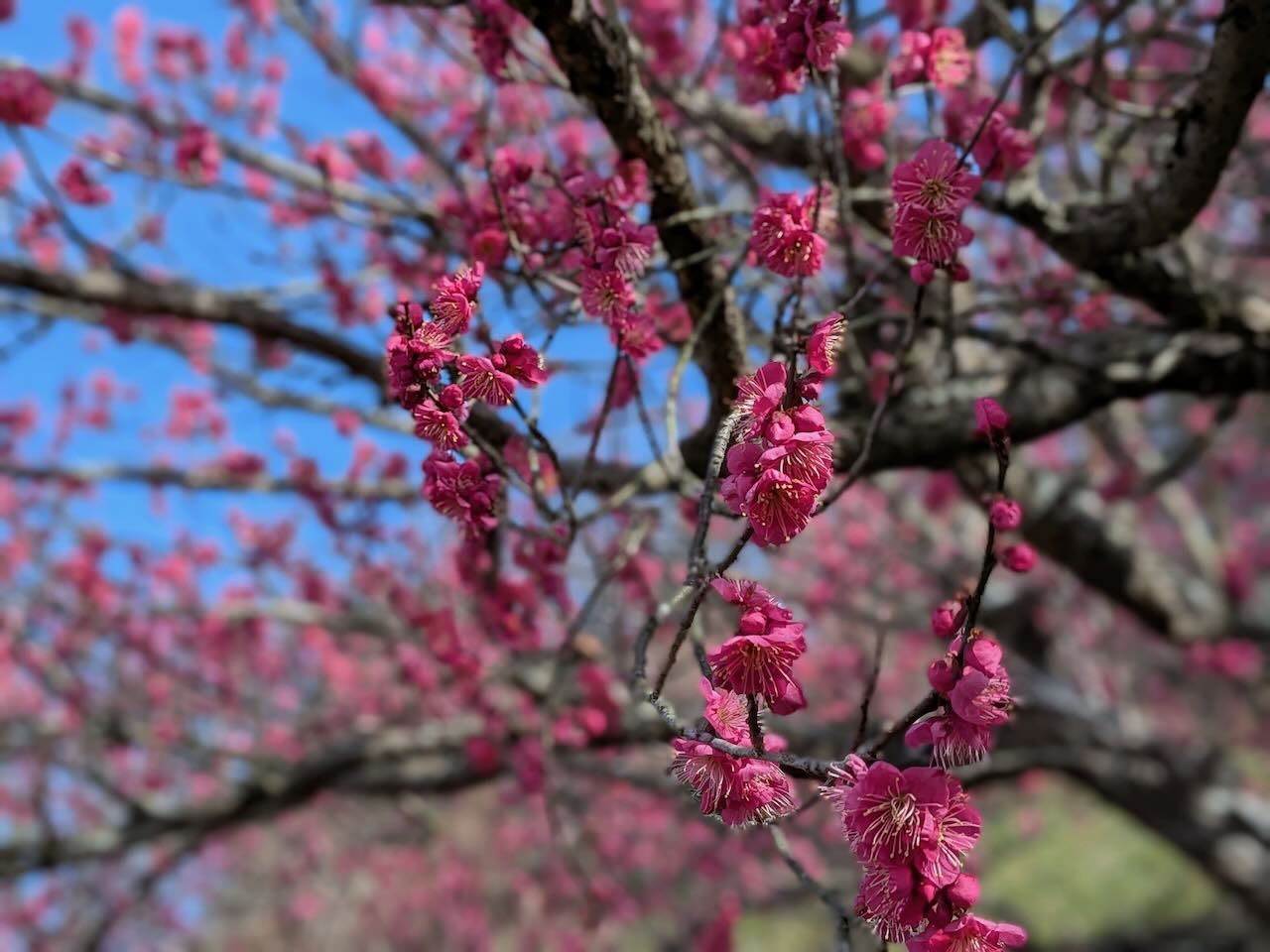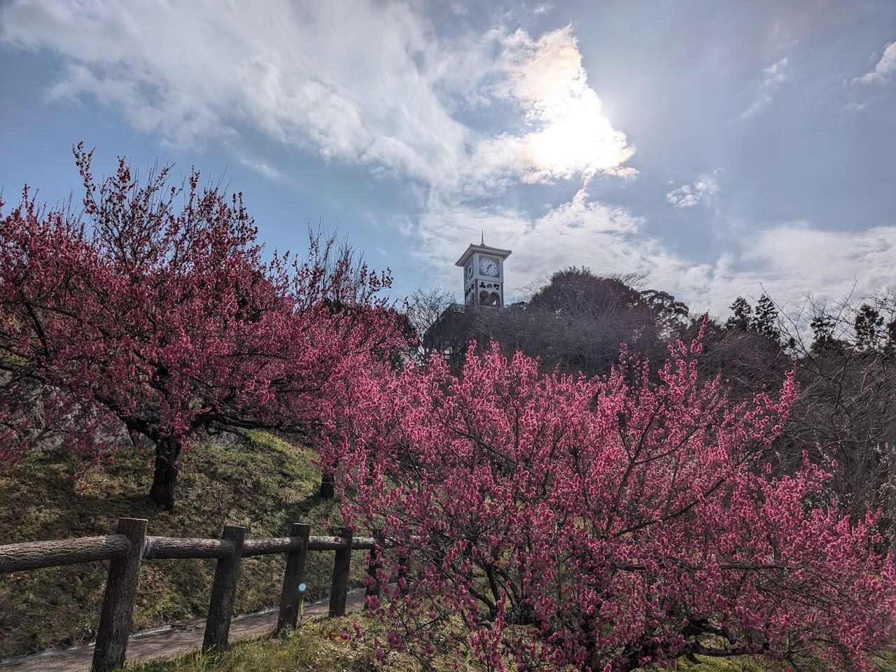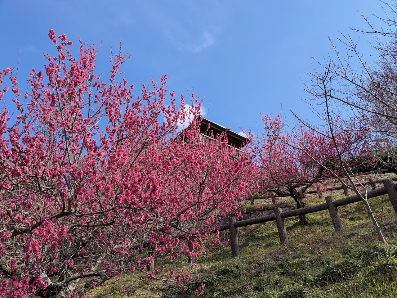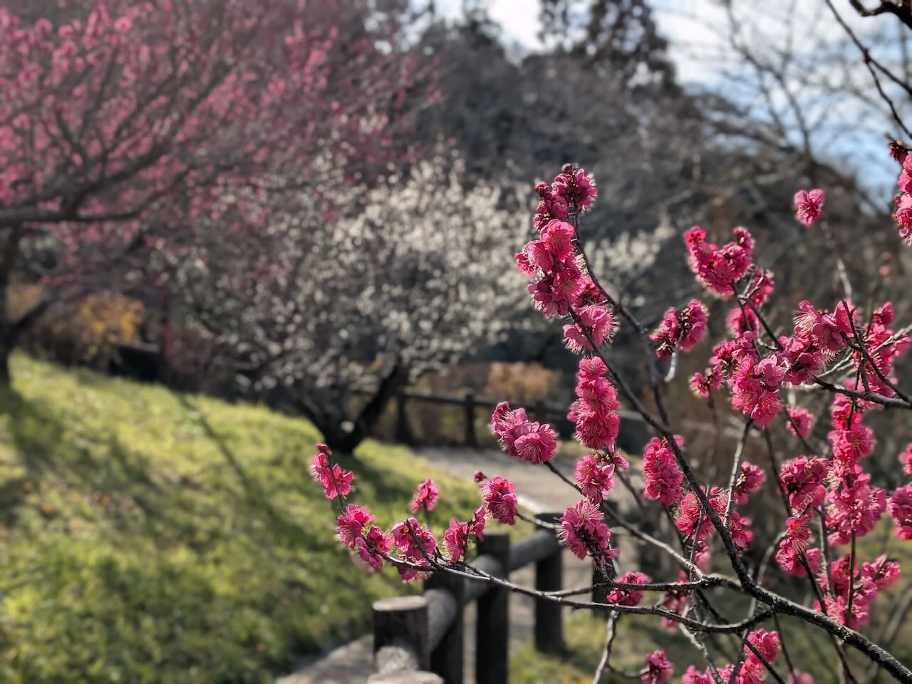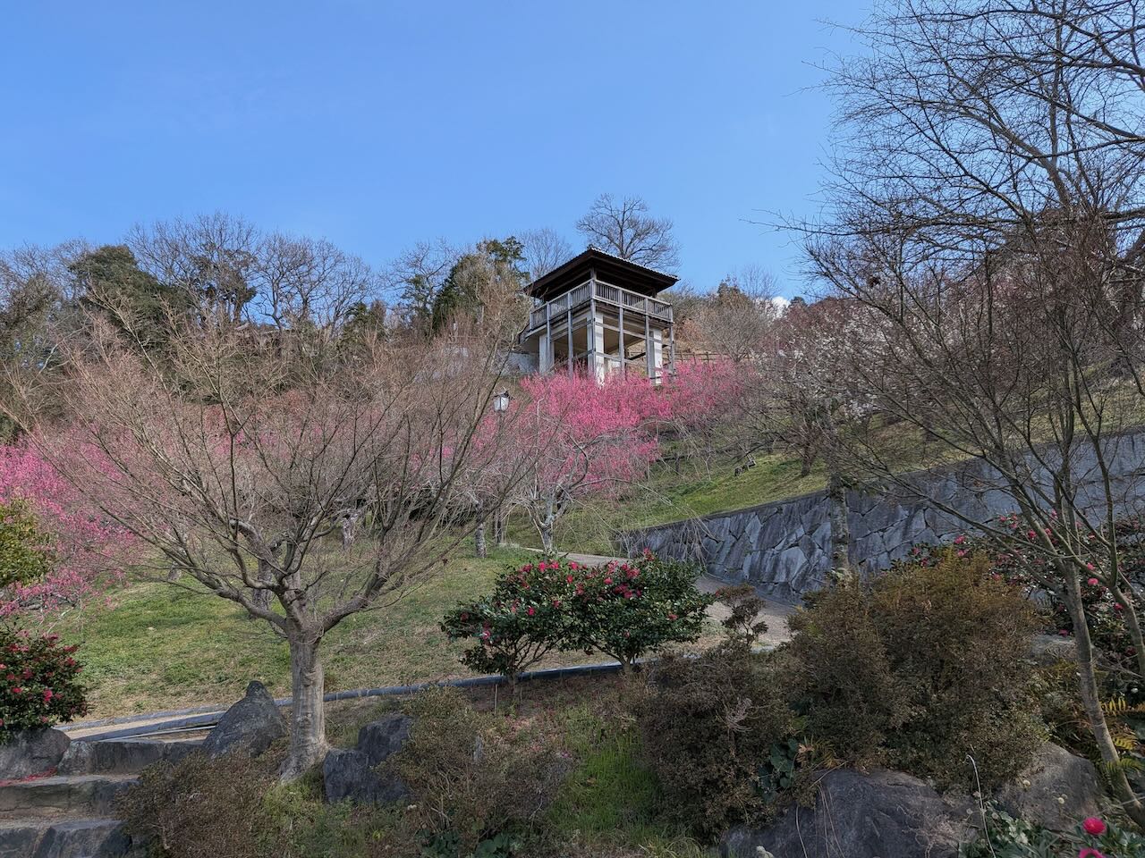 菊間のかわら館で梅が見頃に。寒さの中で際立つ色彩豊かな木々たち(2月5日撮影)